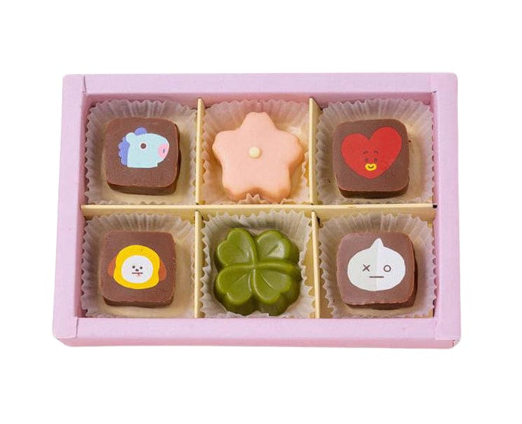 • Chocolate features (4) BT21 characters: Mang,Tata, Chimi, & Van milk chocolates, (1) sakura ganache, and (1) matcha green tea flavored chocolate.