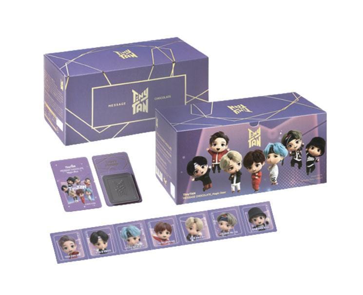 BTS released a TinyTAN Message Chocolate box that includes special messages from all members. Each box contains 8 individually wrapped dark chocolates made by Belcolade, a premium brand of chocolates from Belgium. As an added bonus, you can find 7 out of 49 different sticker designs inside.