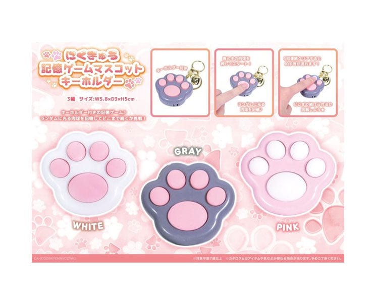 Test your memory and stay entertained with this Cat Paw Memory Game Keychain. Press the large paw pad, then press the smaller toe beans in the order they light up. See how many sequences you can remember! This keychain is easy to attach to purses, backpacks, and keyrings, so you can play anywhere.