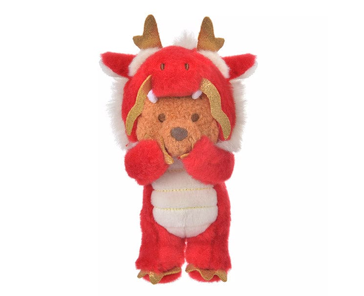 This Roo plush keychain from Disney Japan is dressed in a red dragon costume, celebrating the 2024 Year of the Dragon. It features a plush Roo with a red mane, golden horns, and claws!