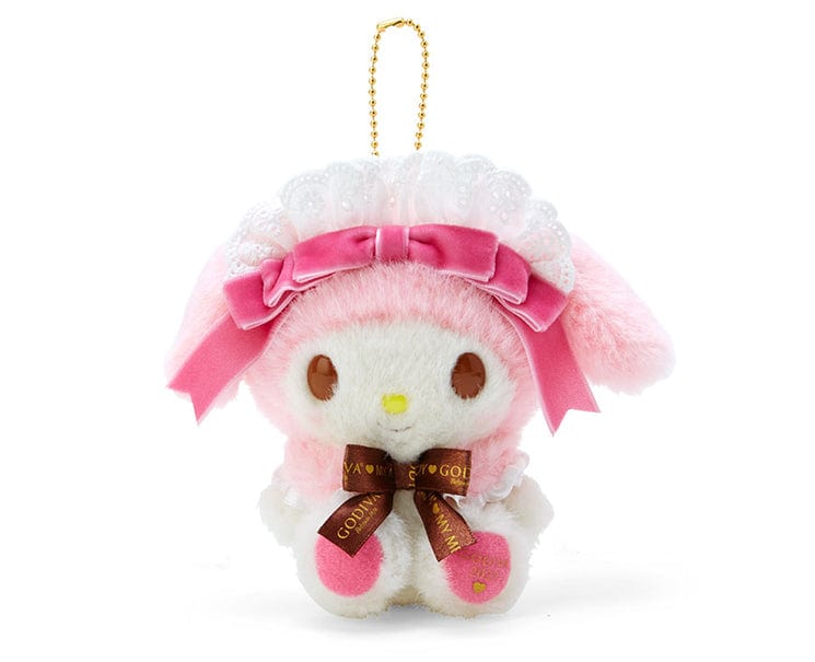 • Godiva x Sanrio collab My Melody mascot keychain with limited edition design and hazelnut chocolate set.