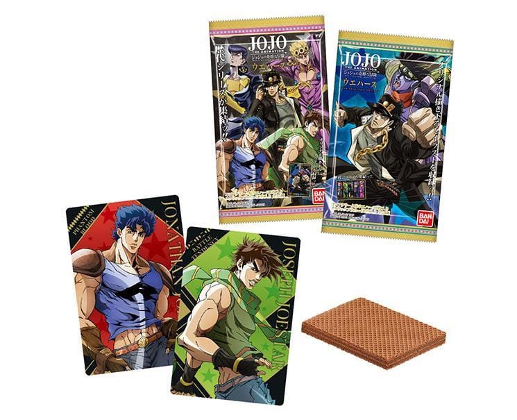 Enjoy these crispy chocolate wafers featuring a JoJo's Bizarre Adventure theme. There are several cards featuring the main characters from the anime to collect. Get yours today!