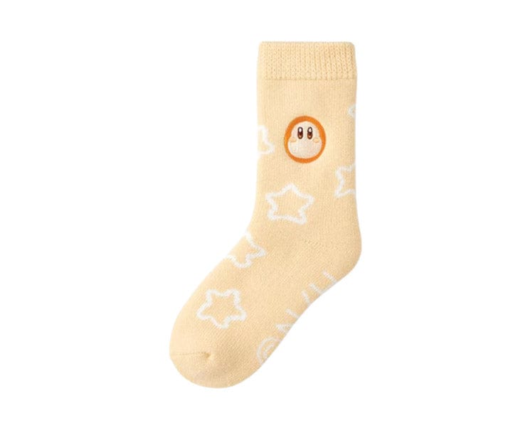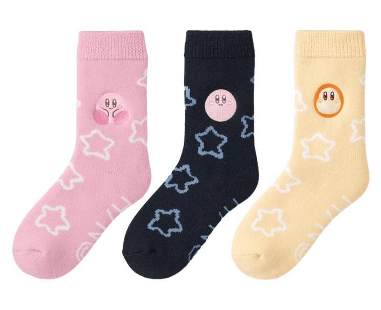Step into comfort with these crew socks, a GU collaboration featuring designs of the world of Kirby! Available in three vibrant colors: pink, navy, and yellow, each pair promises a plush feel for ultimate relaxation!