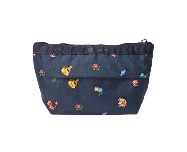 LeSportsac just launched this unique collaboration with Pokemon. Grab this cosmetic pouch featuring a design in which 16 pixel art Pokemons and items such as monster balls and flowers that appear in the game are studded like dots on a navy color base.