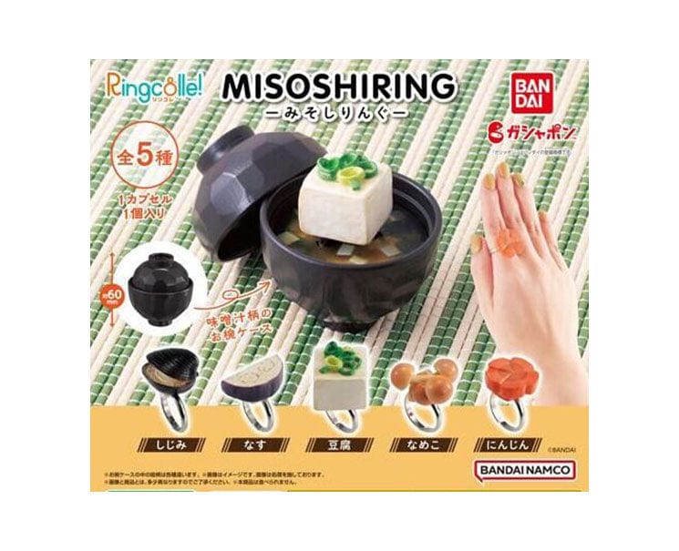 Miso soup 3D ingredients ring gashapon with realistic miso soup bowl black ring box. Get (1) out of (5) super delicious looking miso soup topping rings at random.