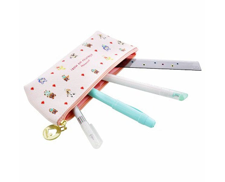 This adorable pink pen pouch features a fun Nintendo Animal Crossing design. This design includes all your favorite characters, from Tom Nook to Blathers. With cute pink accents and a gold leaf zipper pull tab, this pen pouch is fun to use. It's perfect for organizing your pens, pencils, sharpeners, erasers, and other small desk items.