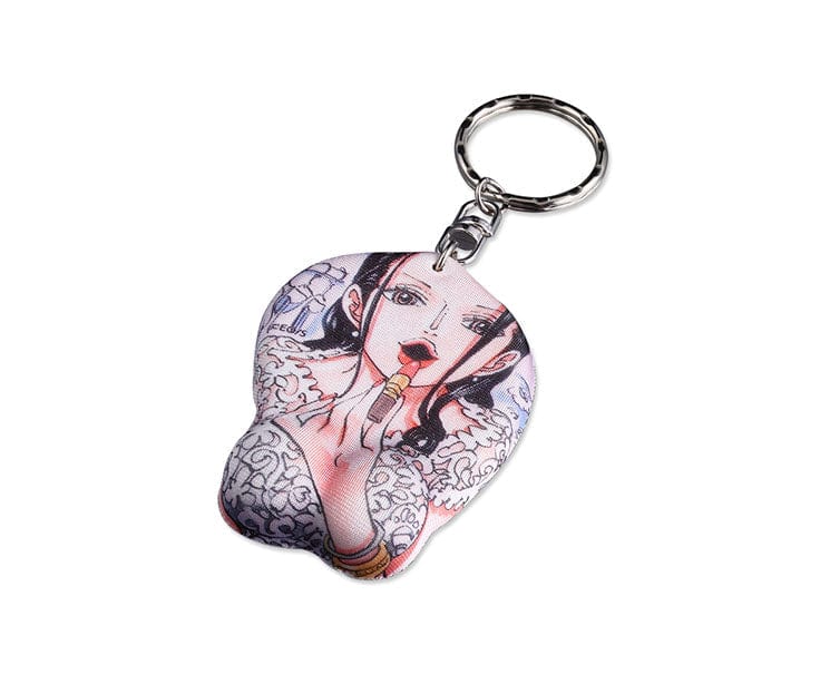 One Piece sexy and sultry Robin elevated and squishy chest keychain with a 3D effect. An image of Robin putting on red lipstick can be enjoyed and put on your keyring.