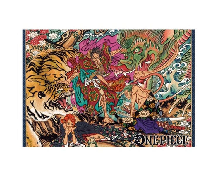 One Piece puzzle that has 300 pieces, two sides and is double the fun! One side has a traditional Japanese style painting with Luffy, Nami, and Zoro! On the other, the straw hat pirates are wearing kimonos!