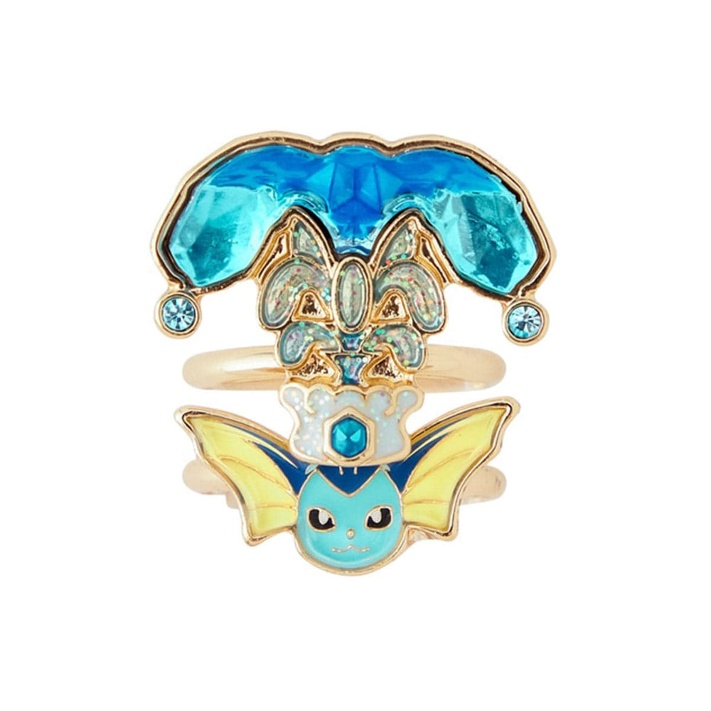 Add a pop of color and a fun piece of jewelry to your outfit with this Pokemon Accessory Ring. This two-piece ring includes a bejeweled Vaporeon that has terastallized. With beautiful blue, white, and yellow accents, this ring pairs with nearly every outfit. Wear the rings together to show off your terastallized Vaporeon, or separate them for a unique appearance. It fits ring sizes 9-13.