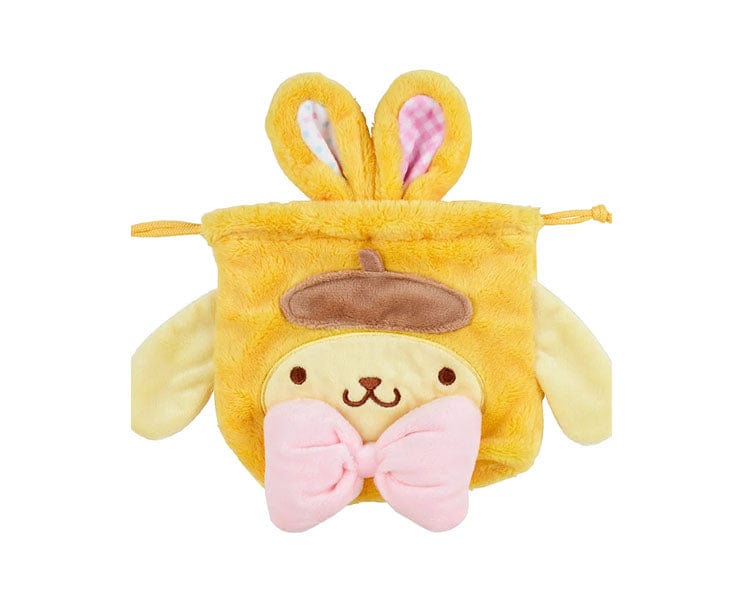 Sanrio Easter 2024 Pouch Set featuring Pompompurin. This set is part of the Easter Rabbit Design Series, capturing the essence of spring with its adorable bunny and Easter egg design. When cinched tight, it transforms into a fluffy bunny and Easter egg, adding a cute touch. It's perfect for organizing small items in your bag while also adding a fun element to your daily routine.