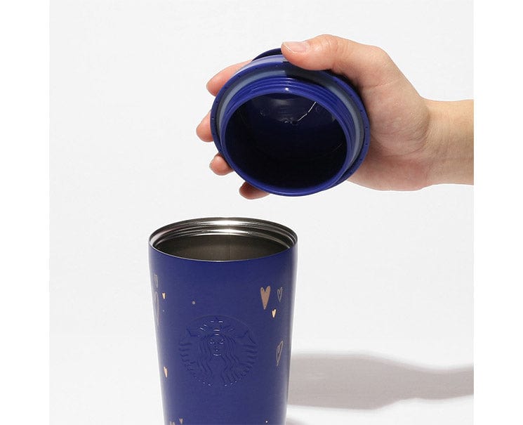 The Starbucks Valentine 2024 TOGO Tumbler features a stylish navy color with cute gold hearts. It's designed with a gold bottom for an extra fancy look and is made of stainless steel to keep drinks hot or cold for longer.