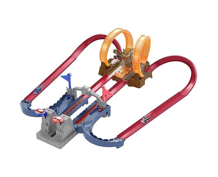 In collaboration with Nintendo, Hot Wheels launched this track featuring a Bowser Castle theme from the Super Mario Kart game! The set comes with 1 Blue Yoshi Kart!